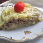 Теперь самая важная часть запеканки - соус. В кастрюльку (желательно не эмалированную) наливаем молоко. Добавляем муку, сливочное масло, мускатный орех, щепотку чёрного перца и солим по вкусу. Всё хорошо размешиваем венчиком и ставим на небольшой огонь. Соус нужно довести до кипения при постоянном помешивании. Когда соус начнёт густеть, в него нужно добавить горсть тёртого сыра и варить соус до тех пор, пока сыр не расплавится. Тогда нужно снять соус с огня и дать остыть 1-2 мин., не больше. Теперь можно разбить в кастрюльку с соусом яйцо и быстро, пока оно не схватилось в горячем, вбить яйцо венчиком.