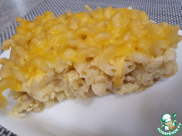 Затем выкладываем оставшиеся макароны. Поливаем их остатками соуса и посыпаем тёртым сыром. Ставим в разогретую до 180-190 градусов духовку и выпекаем до образования золотистой корочки.