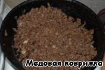 Луковицу мелко нарезать и обжарить до золотистого цвета. Затем на сковородку с луком выкладываем фарш. Солим, приправляем специями и жарим на большом огне до готовности.