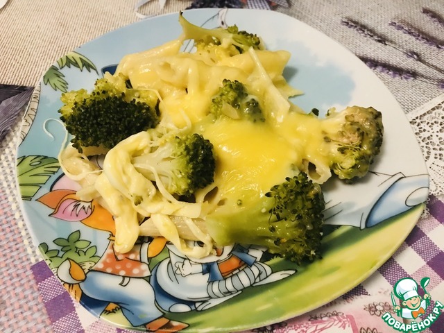 Макароны поставить вариться, посолить. Тем временем обжарить карбонад, добавить брокколи.