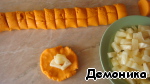 5. Скатать тесто в колбаску и нарезать на части (размер - по желанию). Из каждого кусочка скатать шарик, расплющить и положить кусочки ананаса. Шарик может прорваться и деформироваться. Это не страшно. Работаем с тестом, как с пластилином: всё прекрасно залепляется. Доставать тесто из холодильника частями, вы скоро поймёте, что с холодным тестом работать легче. И ещё мной замеченный нюанс: руки лучше не смачивать, работать сухими руками, иначе тесто начнёт липнуть к рукам и рваться.