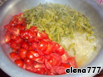 Лук и болгарский перец нарезать соломкой и по отдельности обжарить в растительном масле. Помидоры нарезать дольками.