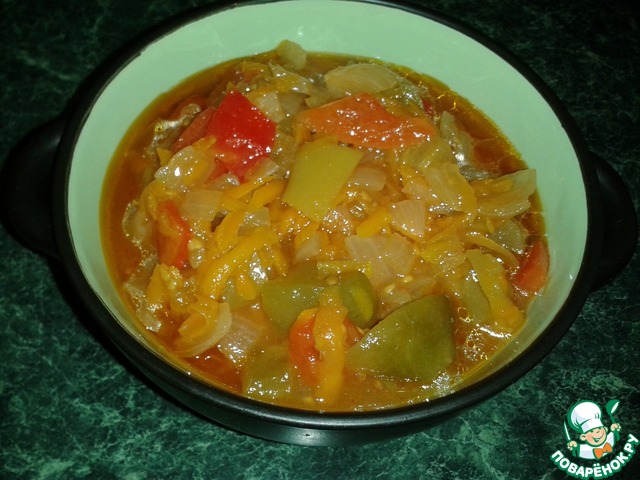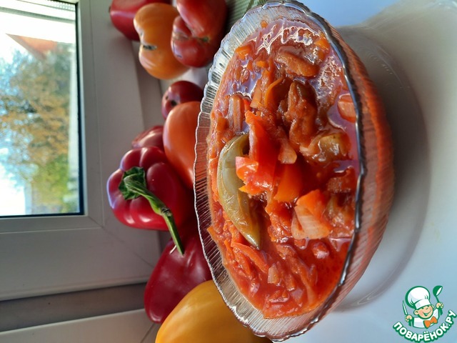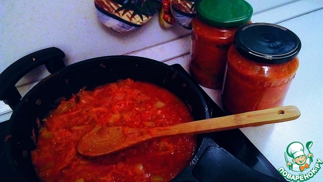 Добавляем оставшийся болгарский перец, подсолнечное масло и томатный соус. Салат станет намного более жидким, но все равно останется густоватым, таким он и должен быть. Варим еще 30 мин. Я варила в этот раз подольше - ориентируемся на готовность помидоров, они должны стать полностью мягкими (но не расползшимися).