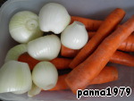 Лук нарезать кольцами, а морковь натереть на крупной терке. Я все это проделала на комбайне, а луковицы у меня были крупные и не входили в отверстие подачи овощей, поэтому у меня полукольца. Зато этот этап у меня занял всего 3 минуты (муж засекал, проверял работу комбайна):)