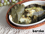 Застелить форму виноградными листьями, выложить филе рыбы, полить ароматным соусом.