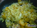 Масло разогреть в сковороде. Выложить туда лук и обжаривать минуты 3. Затем добавить морковь, перец, чеснок и кукурузу. Посолить и поперчить. Тушить под крышкой 5 минут.