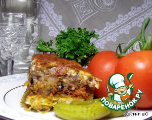 Слой лука с морковью и оливки, поливаем томатной пастой, и опять кашу
