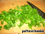 Измельчаем зелень, чеснок (по желанию можно мелко нарезать или выдавить через чеснокодавилку), орехи. Добавляем немного майонеза.