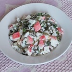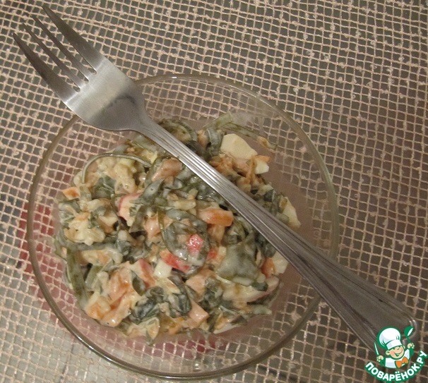 Тщательно все перемешиваем. Это, наверное, самый трудоемкий момент готовки, так как морская капуста очень не хочет равномерно перешиваться. Добавляем майонез (немного, главное чтобы салат не был сухой), соль, перец и еще раз все перемешиваем. Даем салату настояться хотя бы 15-20 минут и можно подавать на стол.
