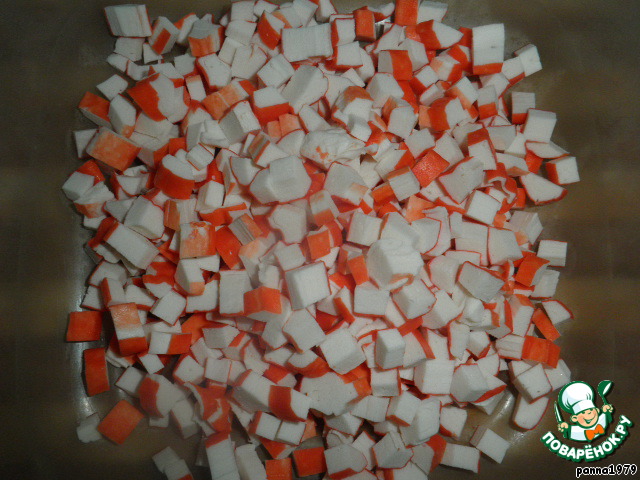 Рис, морковь и яйца отварить. Пока они варятся, режем кубиками крабовые палочки.