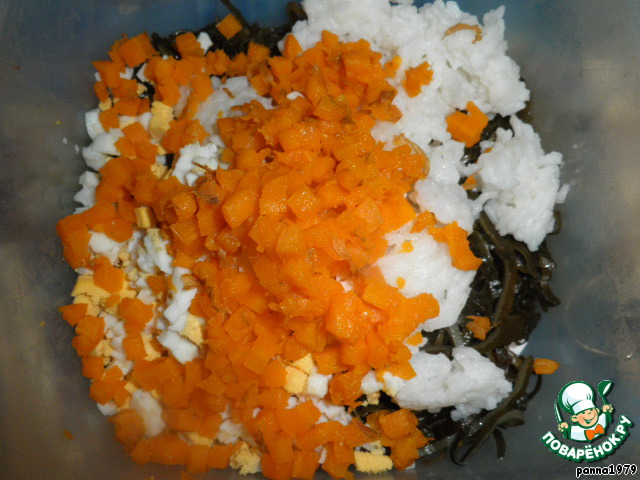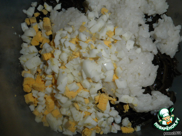 Добавляем морскую капусту. Ее тоже лучше нарезать, так как иначе будет плохо размешиваться салат и неудобно есть.