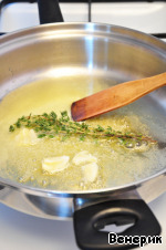 Соединяем в сотейнике оливковое и сливочное масло, разогреваем, добавляем туда тимьян, раздавленный чеснок и доводим до приятного аромата и золотистого цвета.