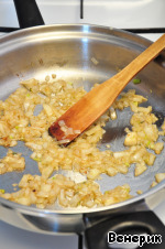 После этого удаляем тимьян с чесноком и закидываем в сотейник репчатый лук, мелко нарезанный. Пассеруем его до золотистого цвета.