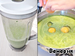 Переливаем суп в блендер, взбиваем (можно взбить в кастрюле погружным блендером, но он у меня, некстати, сгорел), выливаем опять в сотейник, солим, перчим, пробуем на вкус, даём закипеть. А теперь, изюминка этого супа – яйцо «пашот». Яйцо «пашот», обычно в классической кухне, готовится в уксусной воде отдельно, но мы будем готовить «пашот» сразу в супе. Итак…тадададаммм…раз биваем три яйца в суп, вся фишка здесь в том, что белок сворачивается, а желток остаётся жидкий! И здесь надо это поймать!)))