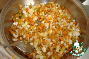 Начинка: потушить овощи мелко нарезанные и в конце добавить мелко нарезанное яйцо.