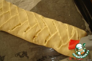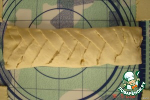 Раскатать тесто в прямоугольную форму и надсечь его как показано на фото, завернуть нижний и верхний края теста на выложенную по центру начинку.