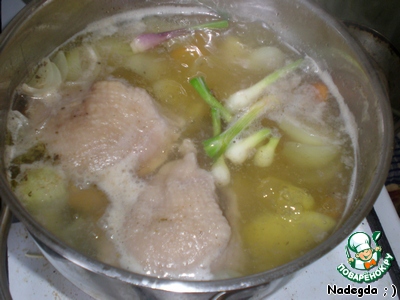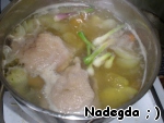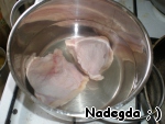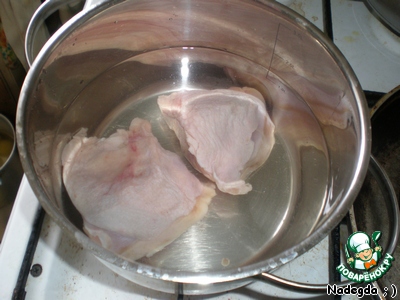 Куриное мясо опускаем в кипящую подсоленную воду (у меня были бёдра и, к сожалению, меньше, чем нужно). Оставляем вариться на среднем огне.