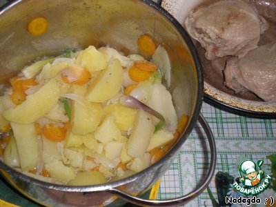 Варим до готовности картофеля. После чего мясо выкладываем, овощи откидываем на дуршлаг, а бульон сливаем в другую посуду. Овощи кладём обратно.
