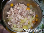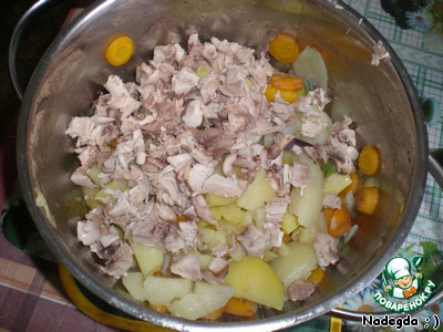 Когда мясо немного остынет, режем его кусочками и соединяем с овощами.
