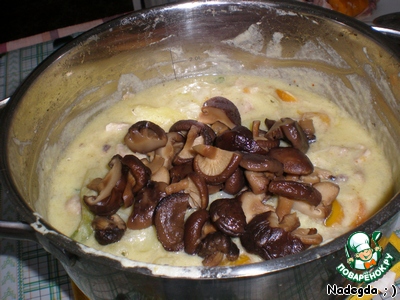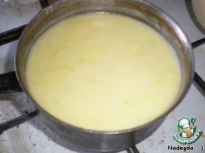 В небольшой кастрюле растапливаем масло и добавляем муку, хорошо размешиваем. Вливаем жирное молоко или сливки, добавляем два желтка. Снова размешиваем, чтобы не было комочков. Затем вливаем наш бульон. Если его получилось немного (стакана 2-3, на глаз), то весь. Можете больше, но смотрите за густотой, она должна быть как у жидкой сметаны. Подсолите и поперчите по вкусу.