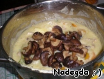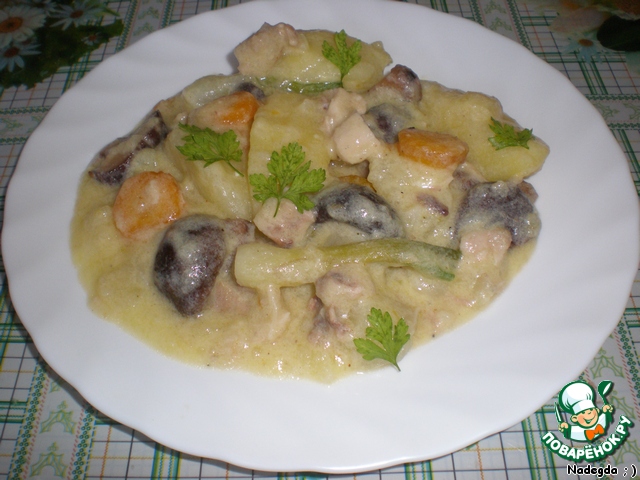 Овощи с мясом заливаем получившимся белым соусом, туда же высыпаем готовые грибы (отваренные или маринованные). Можно добавить зелень. Всё перемешиваем и подаём на стол.