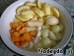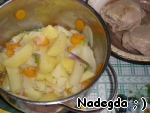 Через 20-30 минут после начала варки мяса кидаем в кастрюлю овощи. Солим, перчим, добавляем приправы. Можно ещё через 15 минут кинуть лук-порей, только стебли (я брала простой лук).