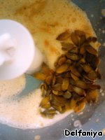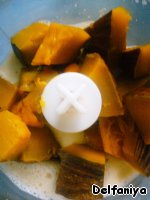 Сюда же измельчаем отваренную (у меня в пароварке) тыкву. После вмешиваем манку с мукой.