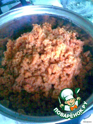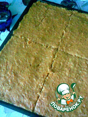 Выложить всю массу на противень, смазанный маргарином, выпекать при температуре 200, 35-40 минут.