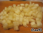 Вливаем разбухший и доведенный на медленном огне желатин, нарезаем небольшими кусочками дыню, добавляем к смеси