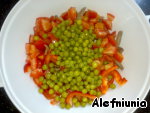 Чеснок измельчить, смешать овощи с горошком и чесноком.