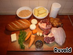 Рулька, конечно, это хорошо, но всё-таки маловато для нашего супа, поэтому вслед за ней из морозилки появятся и остальные ингредиенты для наваристого бульончика. А это - говяжьи голяшки с аппетитной мозговой косточкой и куриная грудка. Вы спросите, зачем такое количество составляющих для бульона? Отвечу вам заранее: во-первых – это вкусно, согласитесь, наваристый бульон гораздо вкуснее, чем чуть мутноватая вода с легким запахом того, что в ней варилось, во-вторых – это надо попробовать! Даю гарантию, вы будете удивлены вкусовым сочетанием трёх вместе сваренных продуктов. А пока можно почистить овощи и отсыпать стаканчик сухого лущёного гороха.