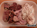 Теперь нужно осторожненько шумовкой достать мясо, оно разварилось, и нужно немного постараться, чтобы оно не плюхнулось обратно в кастрюлю. А мы пока засыплем в скороварку стаканчик гороха и закроем крышкой, пусть немного поварится, буквально минут двадцать, этого будет достаточно, чтобы горох разварился. Зато отделение от костей мяса не составит большого труда: дайте мясу немного остыть и просто потяните за любую приглянувшуюся косточку, мясо почти не шелохнулось, а косточка уже в руках. Я, конечно, немного лукавлю, с рулькой пришлось малость повозиться, но как приятно было отщипывать небольшие, сочные кусочки мяса и отправлять их в рот, каждый раз удивляясь, что курица осталась по вкусу курицей, а говядина говядиной, но в то же время дополнилась легкими оттенками остальных продуктов. Половину мяса мы разберём на волокна и чуть позже отправим в суп, а остальное до супа не доживёт, не успеет. Немного вы раздадите вертящимся вокруг «голодающим», немного оставите себе. Вам вспомнятся былые времена, когда целая варёная курица доставалась из золотистого бульона и исходящая паром ставилась в центр стола на большом блюде. Вокруг рассаживалась вся семья, и родители раскладывали каждому горячую курицу, пытаясь отдать детям самые вкусные кусочки этого бывшего дефицитом лакомства. А в окошко ласково заглядывало солнце, но даже оно не могло затмить собой лучащиеся радостью восторженные глаза детей. И вы даже не заметите, как ваша тарелка стала пустой.
