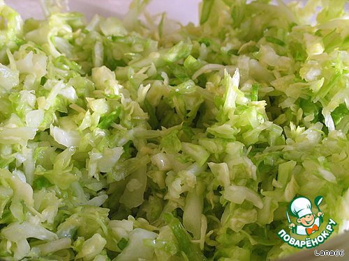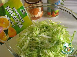 Капусту нашинковать. Немного посолить, добавить сахар и лимонную кислоту.