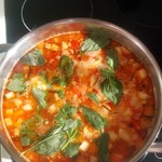 Добавляем оставшиеся овощи, пассеруем еще несколько минут, потом добавляем фасоль и томаты (без кожицы и косточек), нарезанные кубиками. Тушим 3-4 минуты, ммм... какие пошли ароматы…))) Всё! С овощами закончили, теперь осталось добавить только бульон.