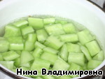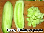 Почистить огурцы и удалить семечки (обязательно даже у не очень мелких, так как в них основная влага). Порезать не мелкими кубиками.