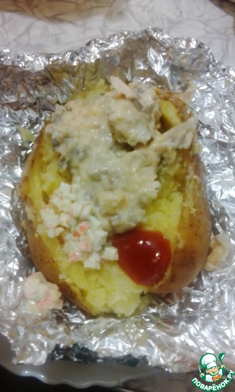 Есть в Украине сеть фаст-фудов - "Печена картопля" (читается: пэчэна картопля). По-русски - печеная картошка. Но, чтобы не нарушать "авторские права" этого фаст-фуда - название привожу "оригинальное". Это один из немногих фаст-фудов, который я решаюсь посещать, т. к. пища достаточно натуральная и не жареная. Они особым образом запекают картошку (далее расскажу как), а потом подают ее с "шариками" разнообразных салатов и закусок. Я обычно беру картошечку с шариком сыра с чесноком и майонезом и шариком соленого лосося. Моя малая предпочитает три шарика: сыр с чесноком и майонезом, лосось и крабовый салат. А вообще, там есть еще "добавки" в виде оливье, селедки с луком, маринованных грибочков и еще много других наполнителей. Как правильно подготовить картошечку, я подглядела у работников этого фаст-фуда и делюсь с вами!