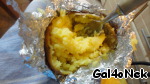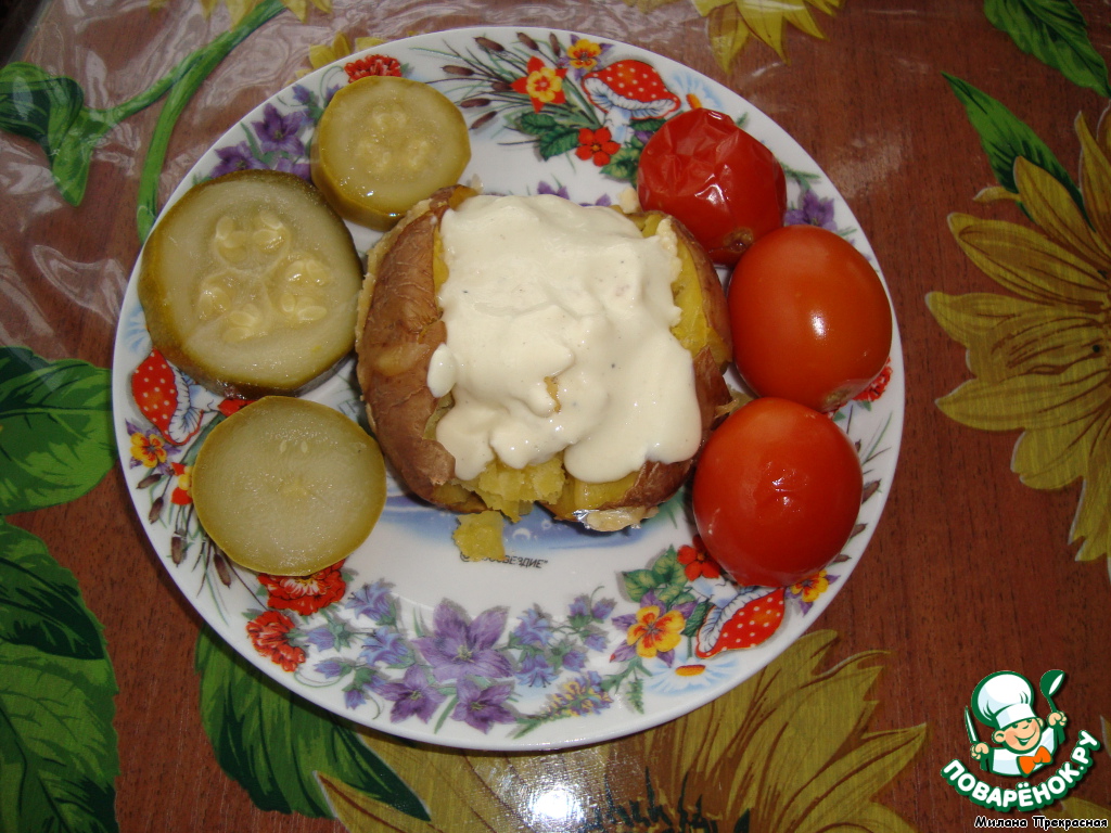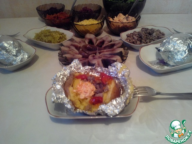 Выставляем на стол все подготовленные салатики. Вынимаем картошечку, раскрываем и кладем на нее любой салатик. Кушаем "подцепляя" немного картошки и салатика. У меня сегодня только сыр с майонезом, чесноком и свежесмолотым перцем. А вообще, тут с наполнителями все в Ваших руках! Конечно, рецепт не очень "быстрый", т. к. картошка печется 1-1,5 часа, но подходит, когда хочется на пикник, а за окном или плохая погода, или зима. Попробуйте, Вам понравится!