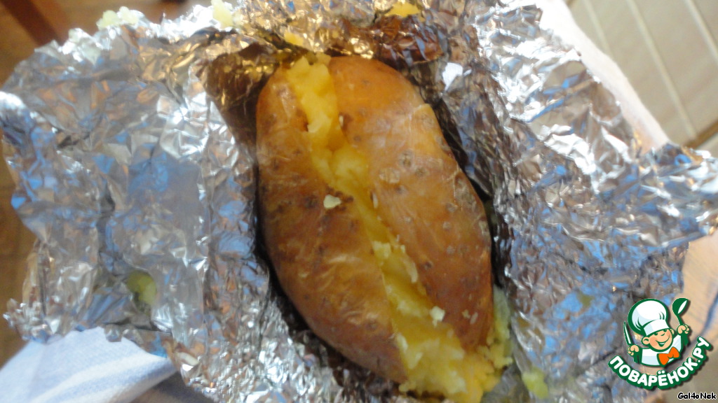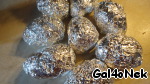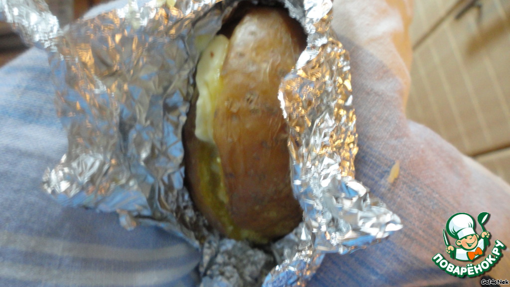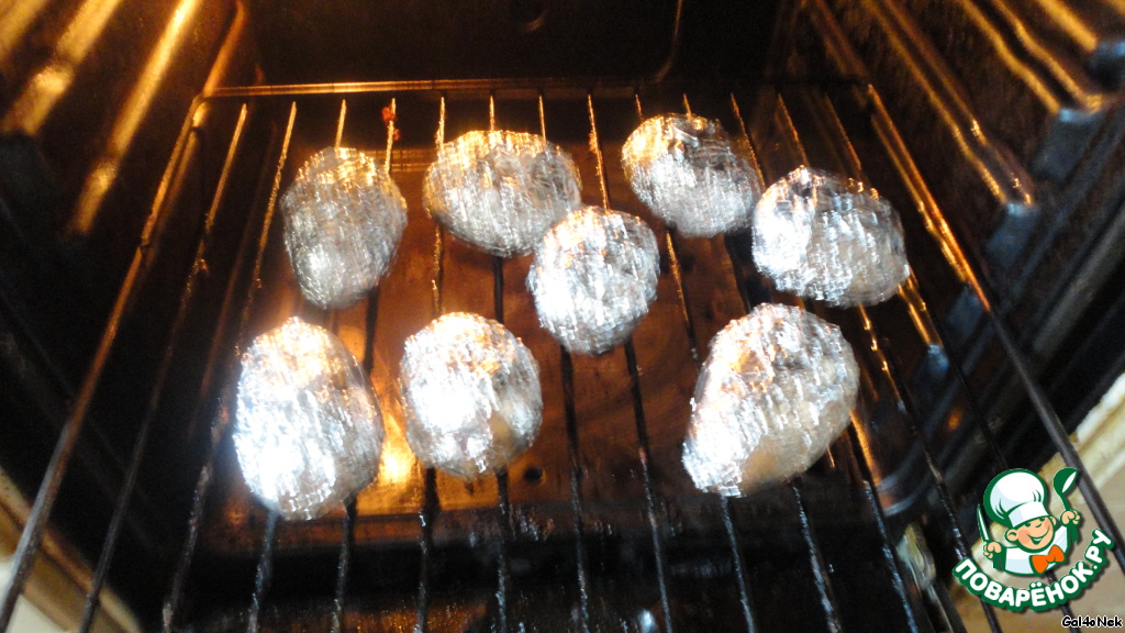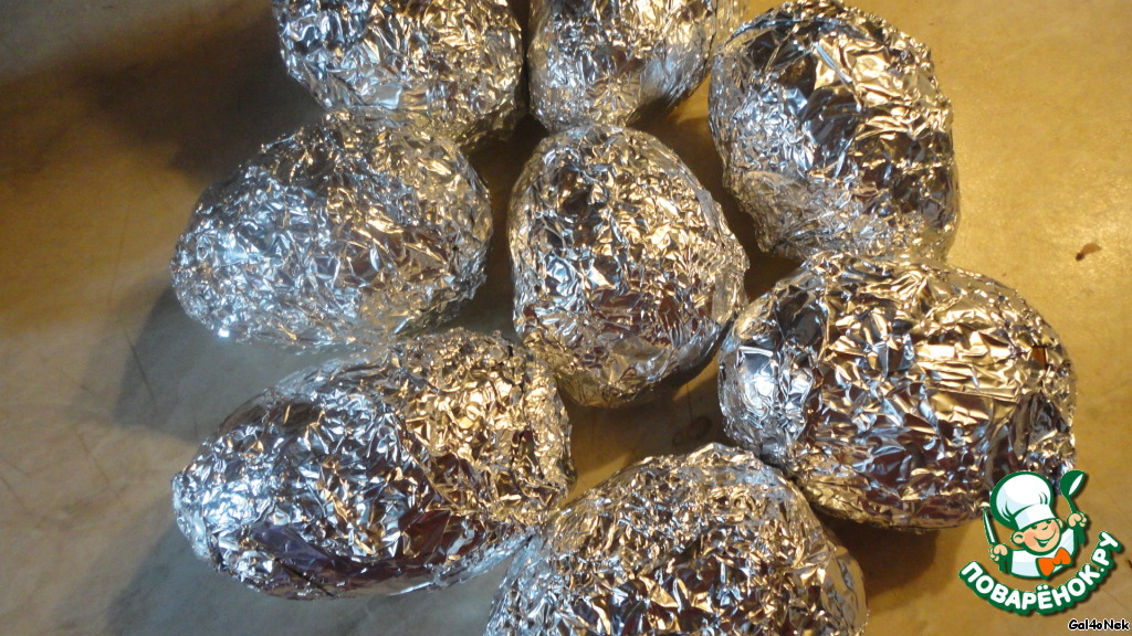 "Закрываем" картошечку, заворачиваем обратно в фольгу. Ставим подготовленную картошечку обратно в духовку, чтобы не остывала. Как только все картошечки "обработаны", духовку выключаем, но картоху не вынимаем до самой подачи.