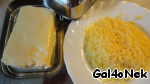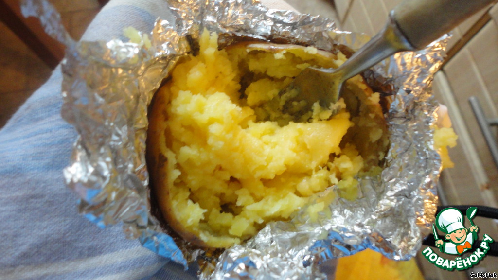 Потом снова раскрываем, берем вилочку. Начинаем "выскабливать" мякоть картофеля до самой шкурки. Перемешиваем равномерно картофельную массу с расплавленным сыром и сливочным маслом.