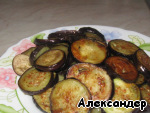 Баклажаны режем кружками и обжариваем на растительном масле. Чтобы они не впитывали много масла, подливаем в сковороду немного воды. Таким образом, как бы тушим баклажаны.