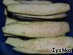 Разрезаем баклажаны вдоль на несколько частей, в зависимости от толщины, примерно 0,5 см. Получившиеся языки солим и оставляем минут на 10-15, чтобы вышла горечь. Затем промываем и просушиваем полотенцем.