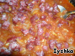 Режем соломкой лук, трем морковь, перец соломкой, все пассеруем. Добавляем помидоры, я тру на терке, шкурка остается в руке, а мякоть стекает в тарелку. И тушим до загустения томата. Можно помидоры заменить томатной пастой. Мелко режем чеснок, добавляем соль и специи. В конце добавляем мелко нарезанную кубиками копченую колбасу. Может, кому-то это покажется лишним, но я пробовала именно в таком варианте, мне понравился привкус копчености. Это наша заливка.