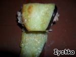Приступаем к рулетикам. Язык баклажана кладем на досочку, на него кладем кусочек фарша и закручиваем.