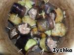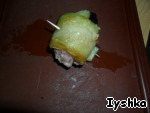 Вот такой рулетик получается. Скалываем его зубочисткой. Так поступаем со всеми баклажанами.