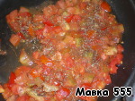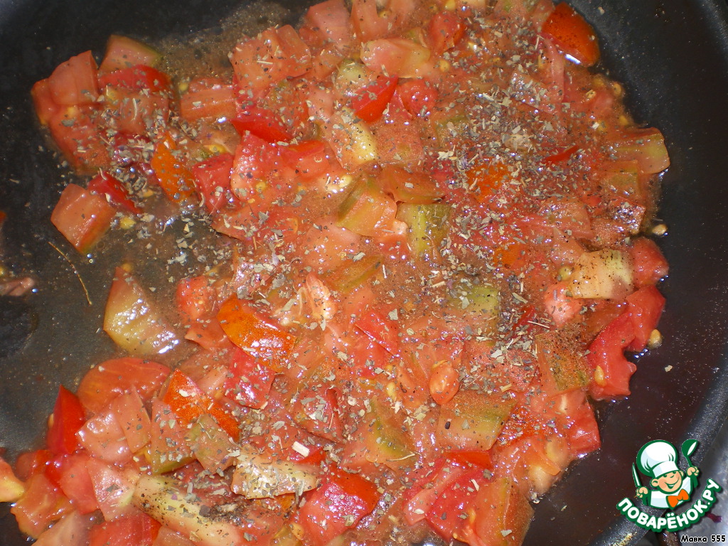 Когда помидоры дадут сок, добавляем ложку молотого базилика и все это перемешиваем, убавляя огонь до минимума.