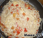 Тем временем спагетти уже готовы. Промываем их холодной водой и отправляем на сковороду к помидорам, добавляем натертый сыр (иногда еще добавляю туда чеснок) и все тщательно перемешиваем.