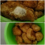 Кидаем кусочки курицы в почти закипевшее масло. Хорошо, если масло полностью покроет курицу. Если нет - лучше примять вилкой. Я делал так: курица жарилась минуты 3, потом я переворачивал ее лопаткой, после еще 3-х минут закрывал на 2 минуты крышкой, потом доставал. В то время как жарится одна порция курицы, трясем в пакете другую порцию.