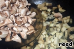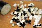 Баклажаны и шампиньоны нарезать небольшими кубиками. Чеснок порубить. -