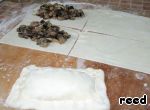 Тесто раскатать, разрезать на равное количество квадратов. На середину каждого положить начинку, накрыть другим квадратом. Защипать края пирожков.