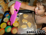 Первый противень закончился и ушел на выпечку, а тесто все еще присутствовало, и энтузиазм у помощников не угасал:) Было решено сделать маленькие кексики, но тут и формочки закончились, а тесто - все еще нет. Остатки теста выложила в формы для печенья.